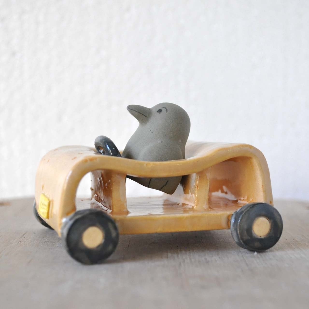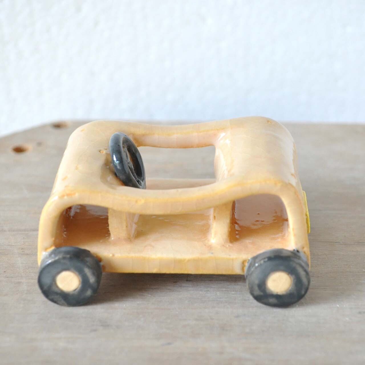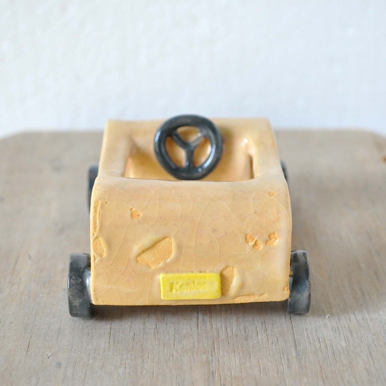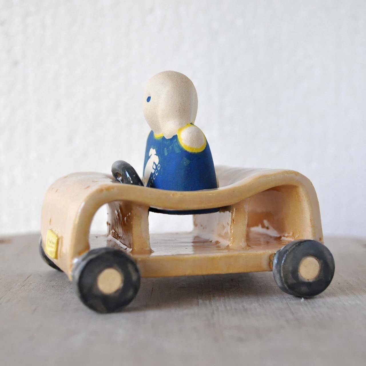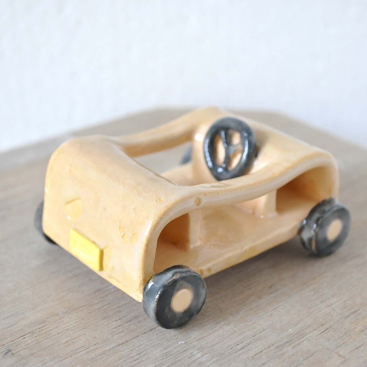 This ceramic car is entirely handmade, giving each piece its own unique charm. Depending on the size of the finger puppet, it can be placed in the car. Please refer to the images for an example of a puppet seated.