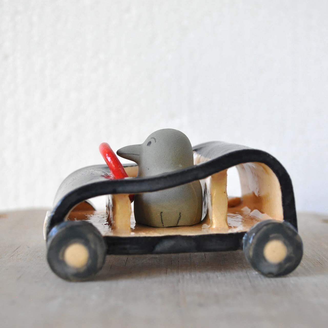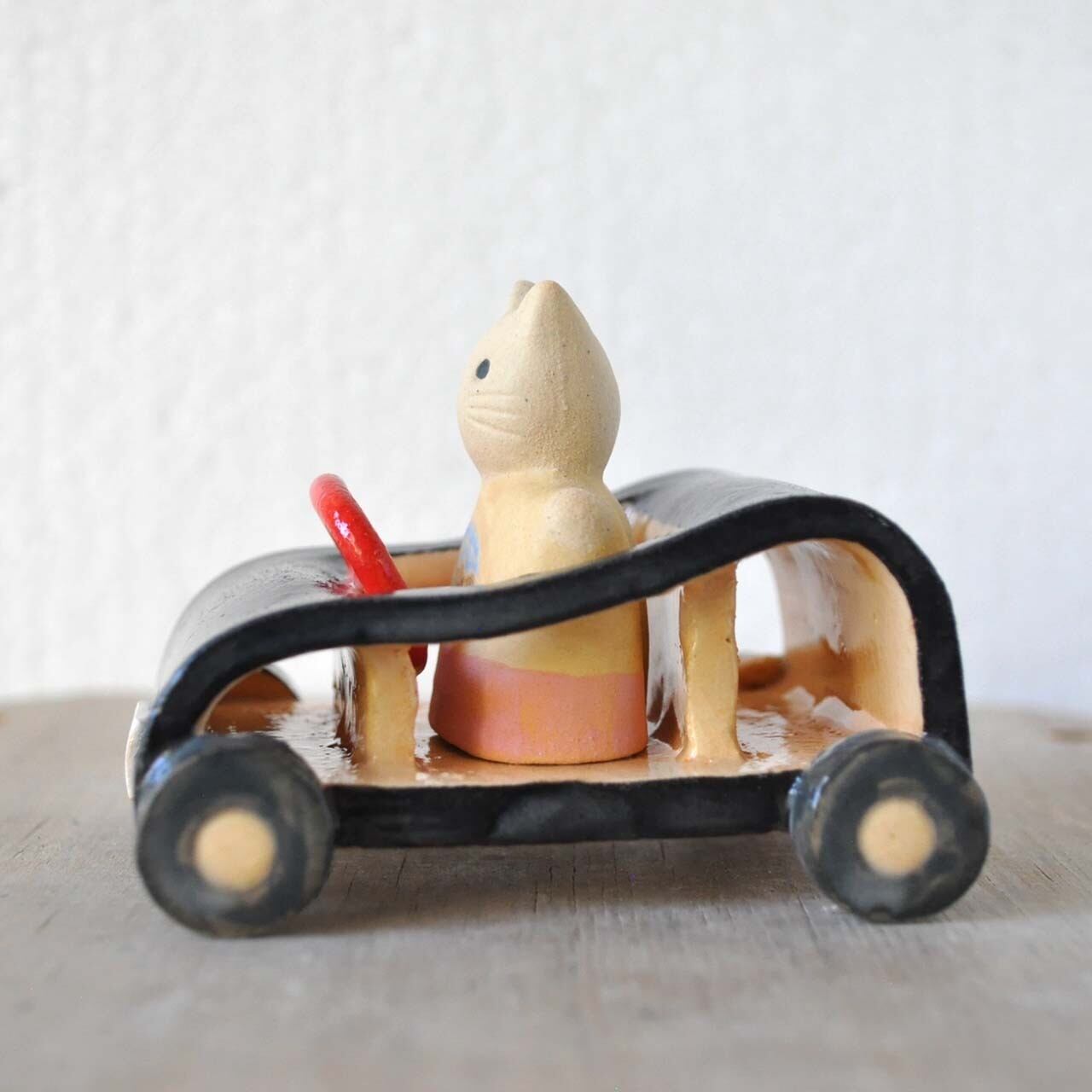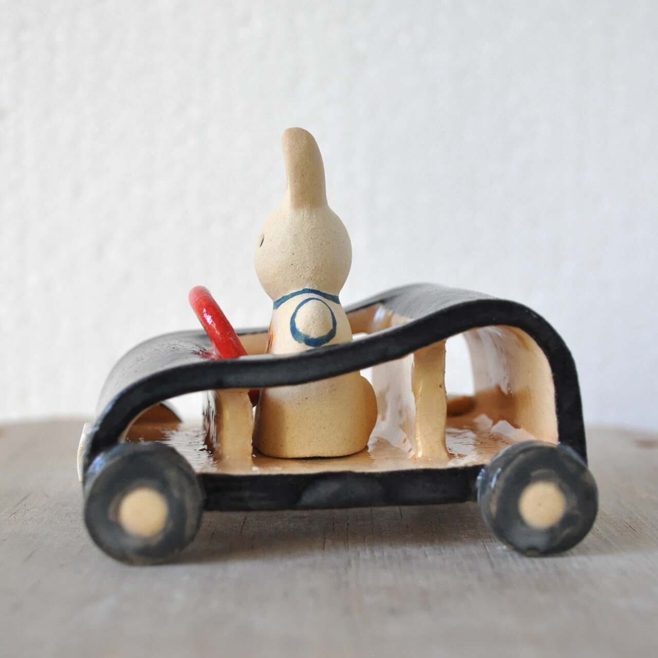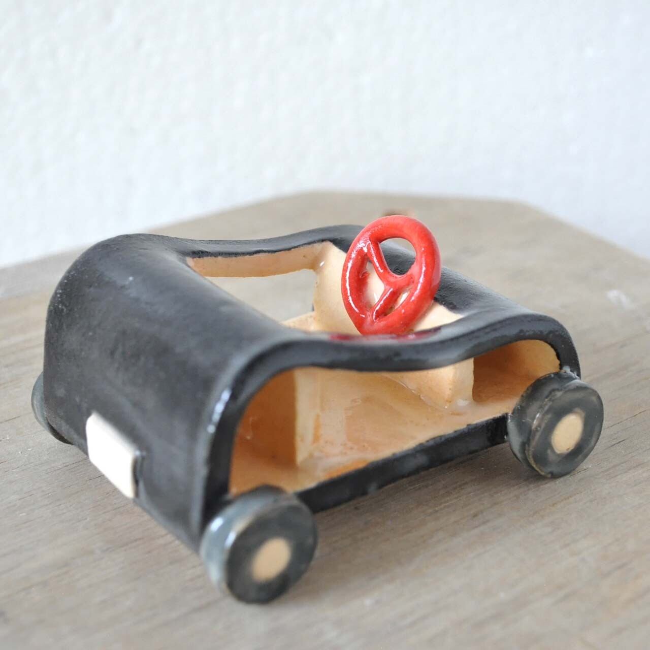 This ceramic car is entirely handmade, giving each piece its own unique charm. Depending on the size of the finger puppet, it can be placed in the car. Please refer to the images for an example of a puppet seated.