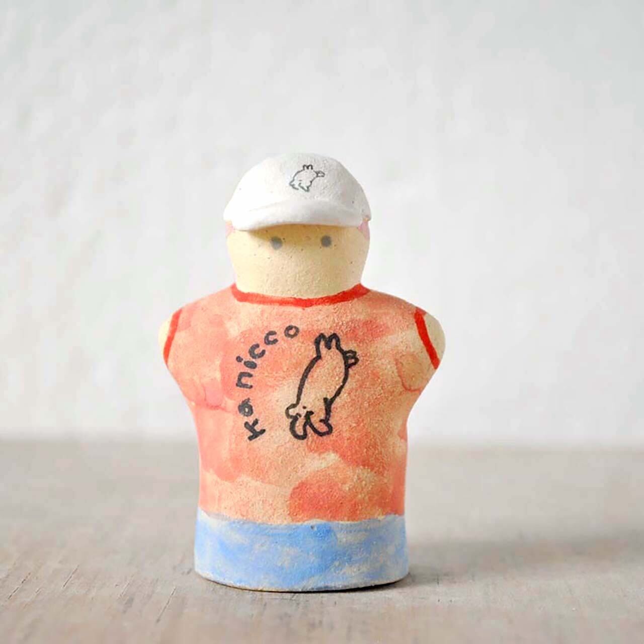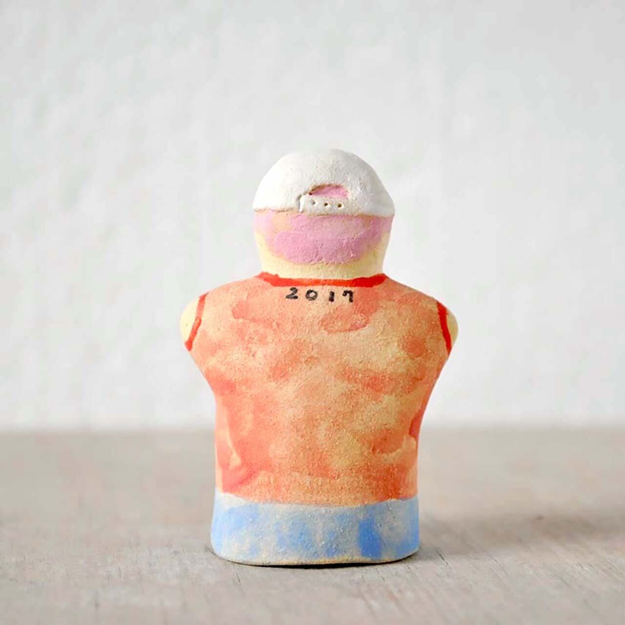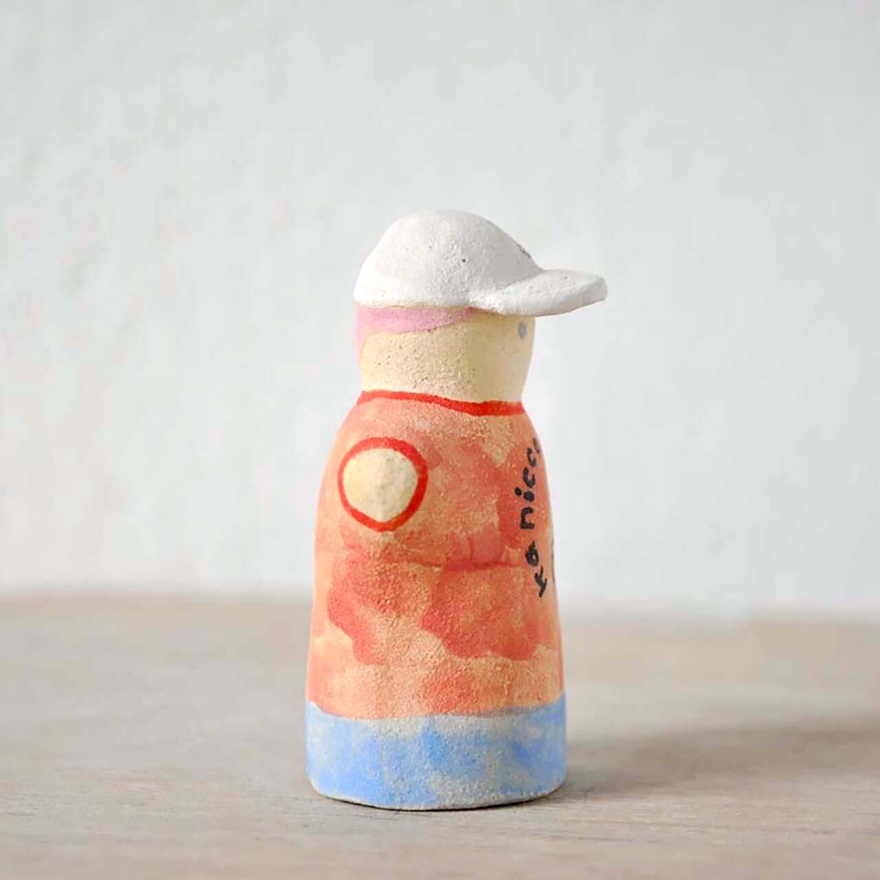 This is a ceramic finger puppet in the shape of a person, slip-cast and hand-painted.