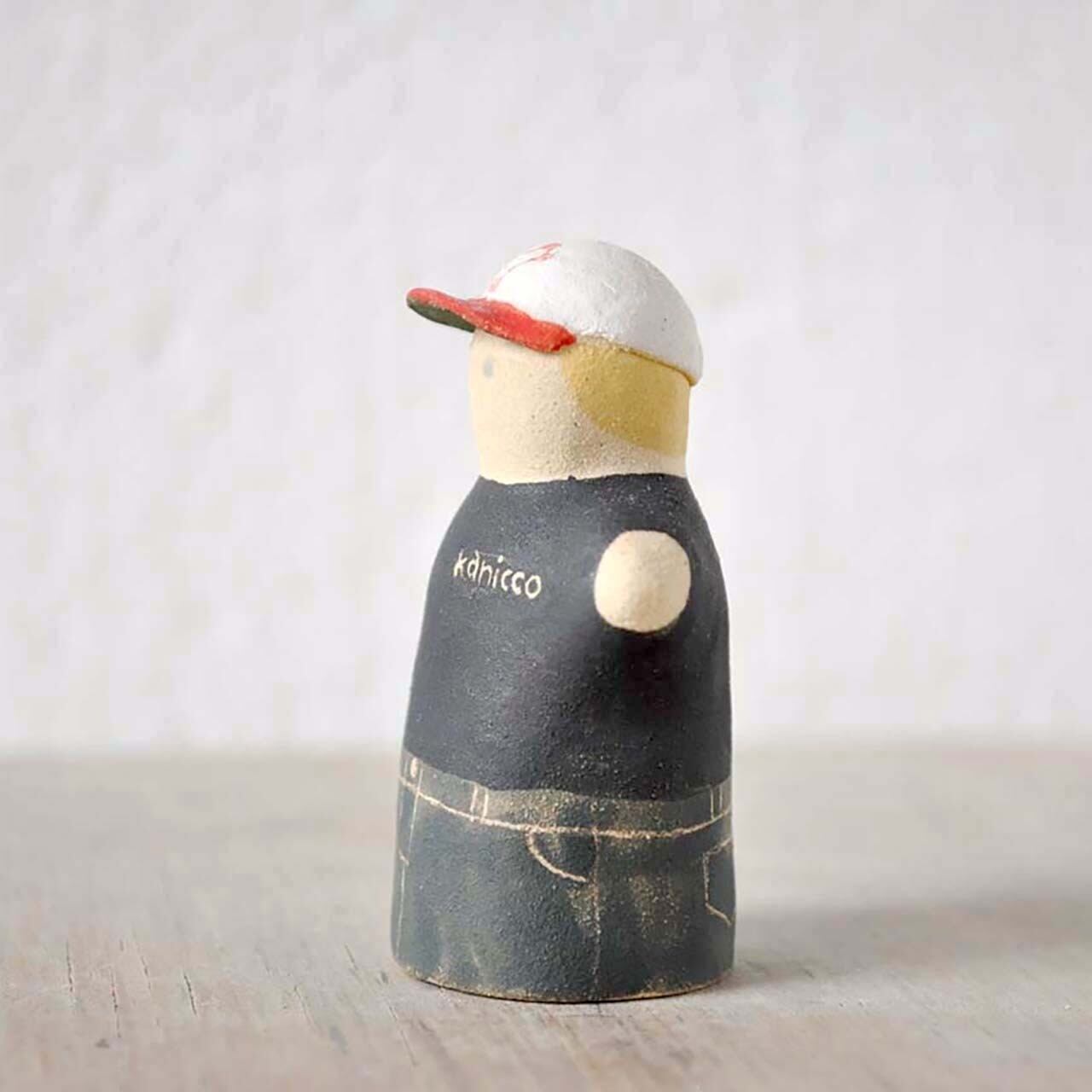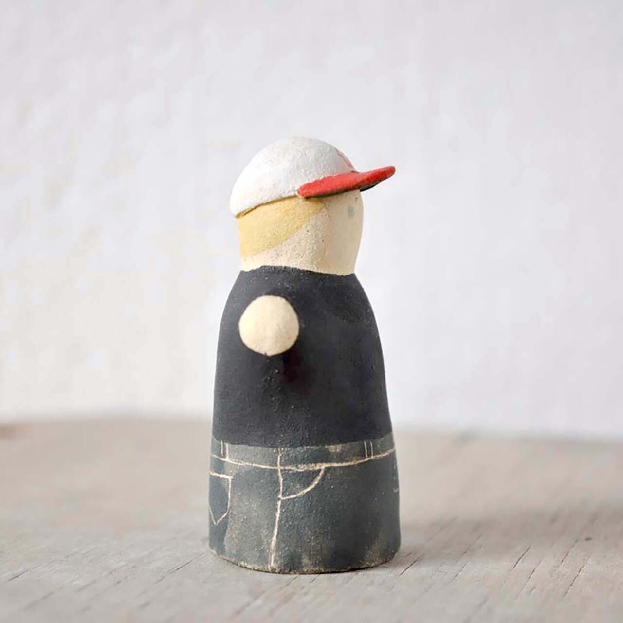 This is a ceramic finger puppet in the shape of a person, slip-cast and hand-painted.