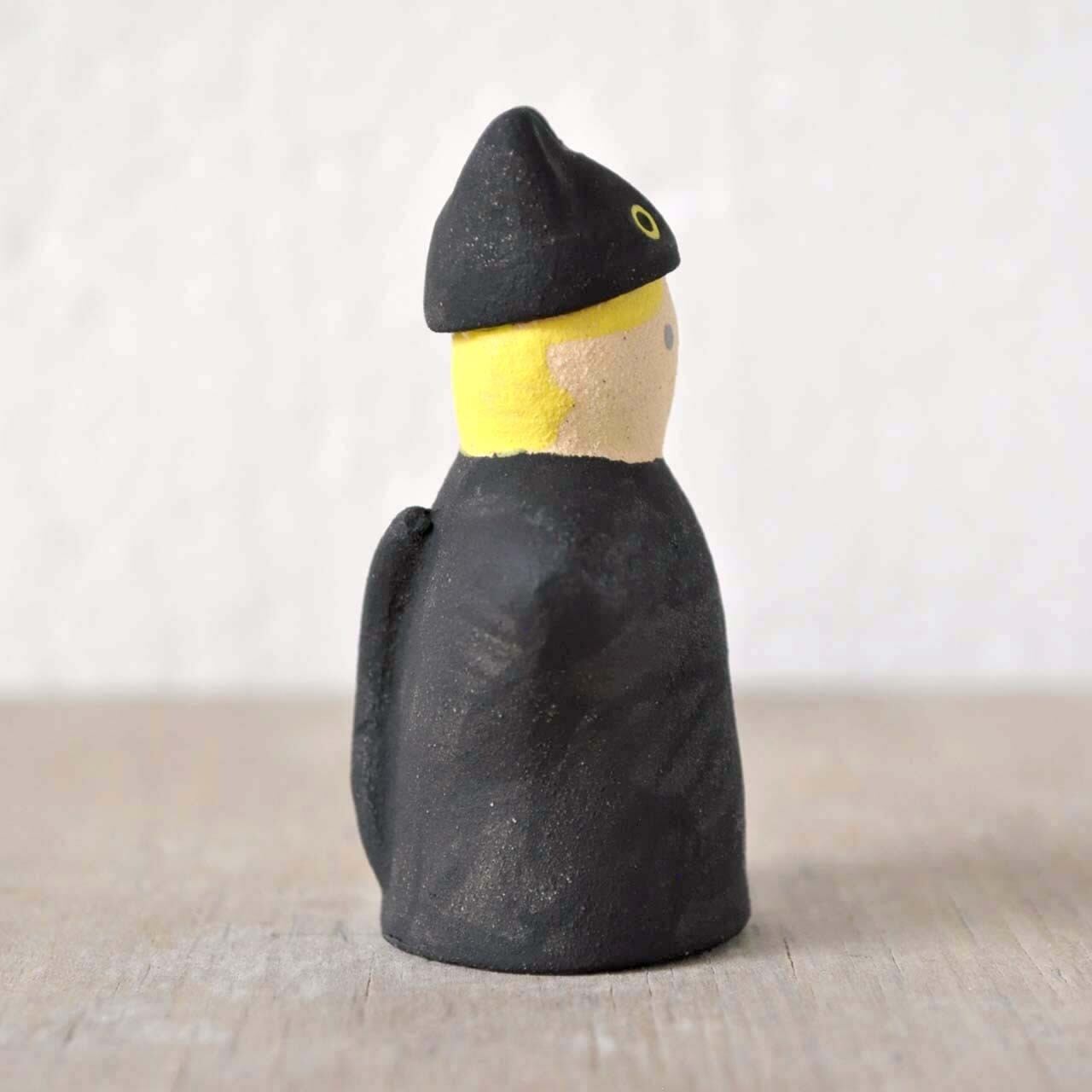 This is a ceramic finger puppet in the shape of a person, slip-cast and hand-painted.