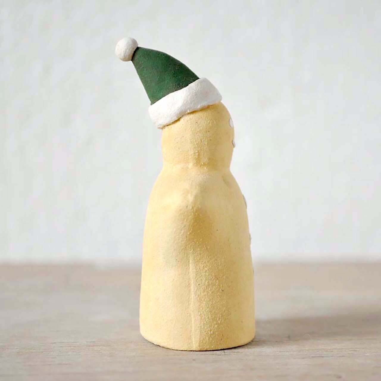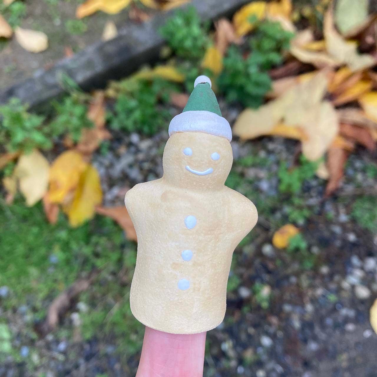 This is a ceramic finger puppet in the shape of a person, slip-cast and hand-painted.