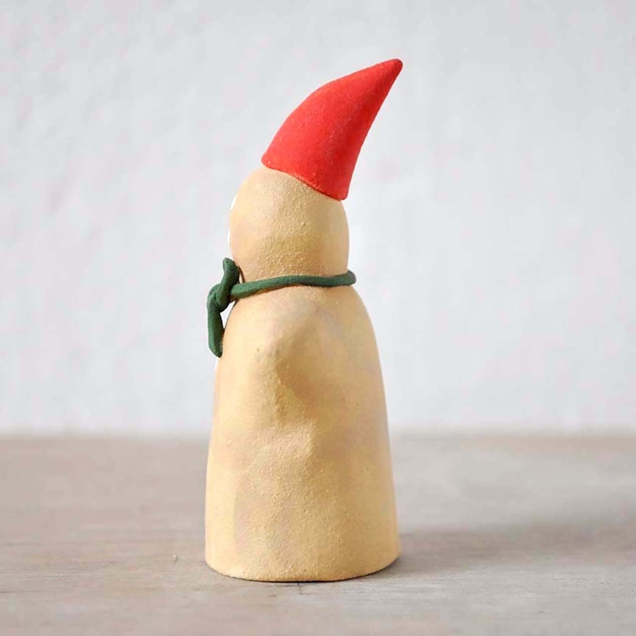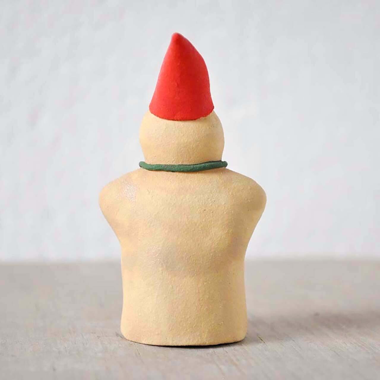 This is a ceramic finger puppet in the shape of a person, slip-cast and hand-painted.